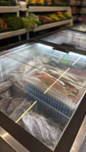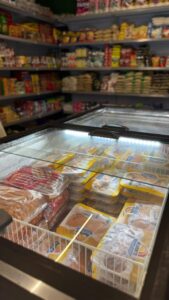 Além da variedade de carnes, o Frigorífico Almeida também disponibiliza frutas, verduras e um espaço destinado a produtos variados, permitindo que o cliente encontre diferentes itens em um só lugar.